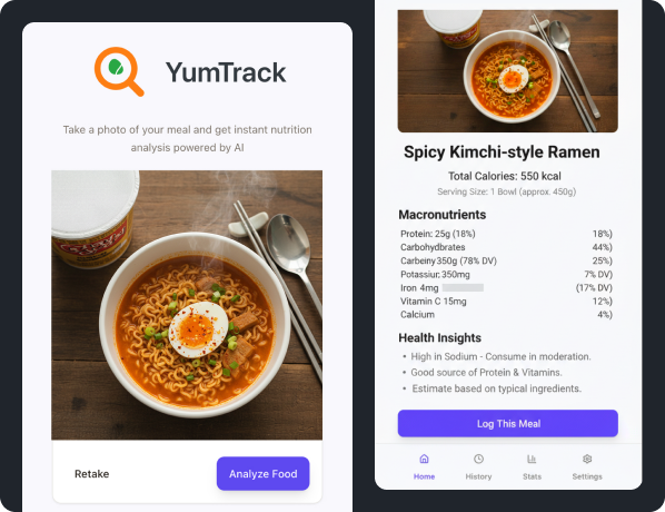 YumTrack은 컴퓨터 비전과 AI 기반 음식 인식을 결합하여 영양 추적을 혁신하며, 사용자가 사진을 통해 즉시 식사를 기록할 수 있도록 합니다. 이 프로그레시브 웹 앱은 시각 우선 인터랙션, 포션 크기 추정, 과거 식습관 분석을 통해 식사 기록 시간을 수분에서 수초로 단축하면서 추적 정확도를 향상시킵니다.