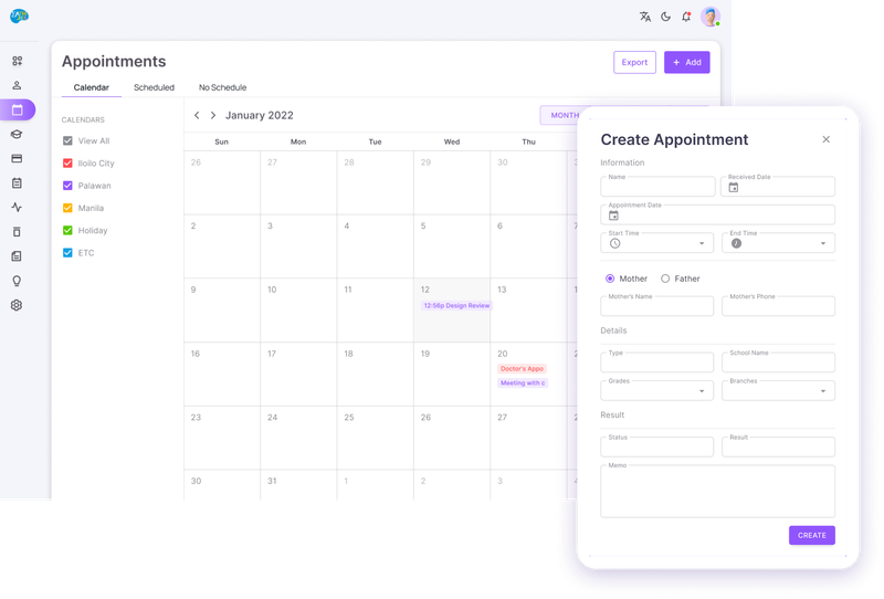 캘린더 기능은 관리자, 교사 및 학생이 약속 날짜, 수업 시작 및 종료 날짜 등을 확인할 수 있도록 도와주며, 정렬 및 색상 코딩을 통해 명확성을 높입니다.