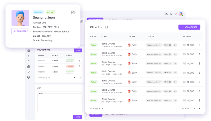 학생 데이터는 표 형식으로 정리되어 있어 편리한 모니터링이 가능하며, 상태, 계약 종료일, 수업료 등의 중요한 정보를 쉽게 확인할 수 있으며 특정 정보를 검색할 수도 있습니다.