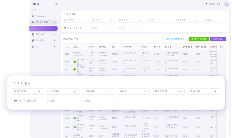 프로젝트 관리 시스템은 광고 마케팅 프로젝트 관리를 간소화하고 실시간 데이터 모니터링을 통해 비즈니스 프로세스를 개선하기 위해 개발되었습니다. 사용이 편리한 대시보드를 구성하고 다양한 프로젝트 관리 기능을 구현하며, 클라이언트 및 비용 관리 기능을 통합했습니다. 주요 성과로는 직관적인 인터페이스 제공 및 테스트 과정에서 발견된 문제 해결이 포함됩니다.
